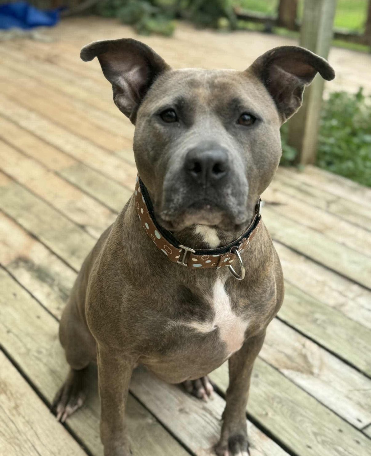 Andy has a chatty, expressive side and isn’t shy about sharing her opinions (especially if she thinks she’s missing out on the fun). Because of her enthusiasm and size, she’d do best in a home with older children or teens, and an active family who’ll keep her mind and body busy.